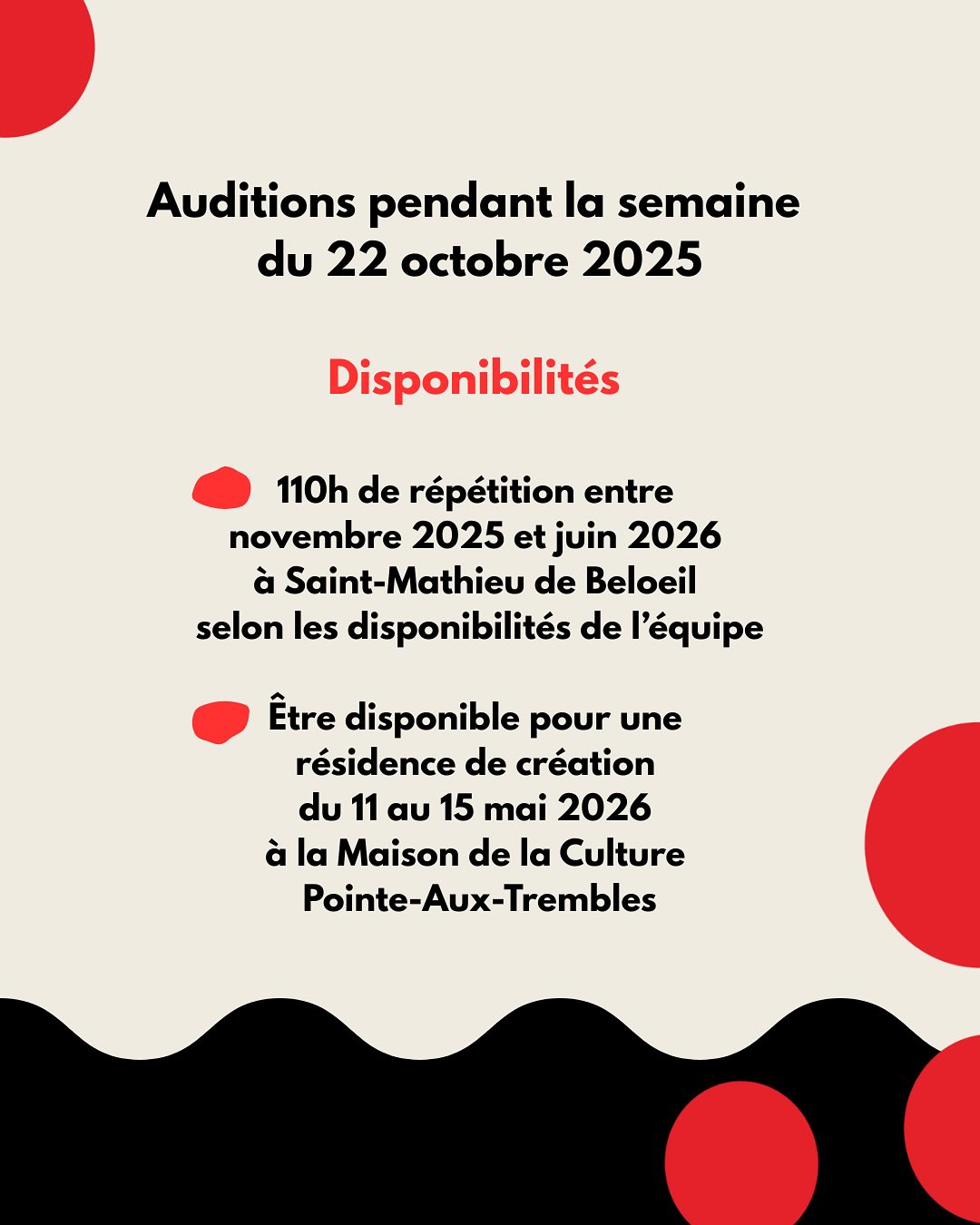 - 110h de répétition entre novembre 2025 et juin 2026 à Saint-Mathieu de Beloeil selon les disponibilités de l’équipe